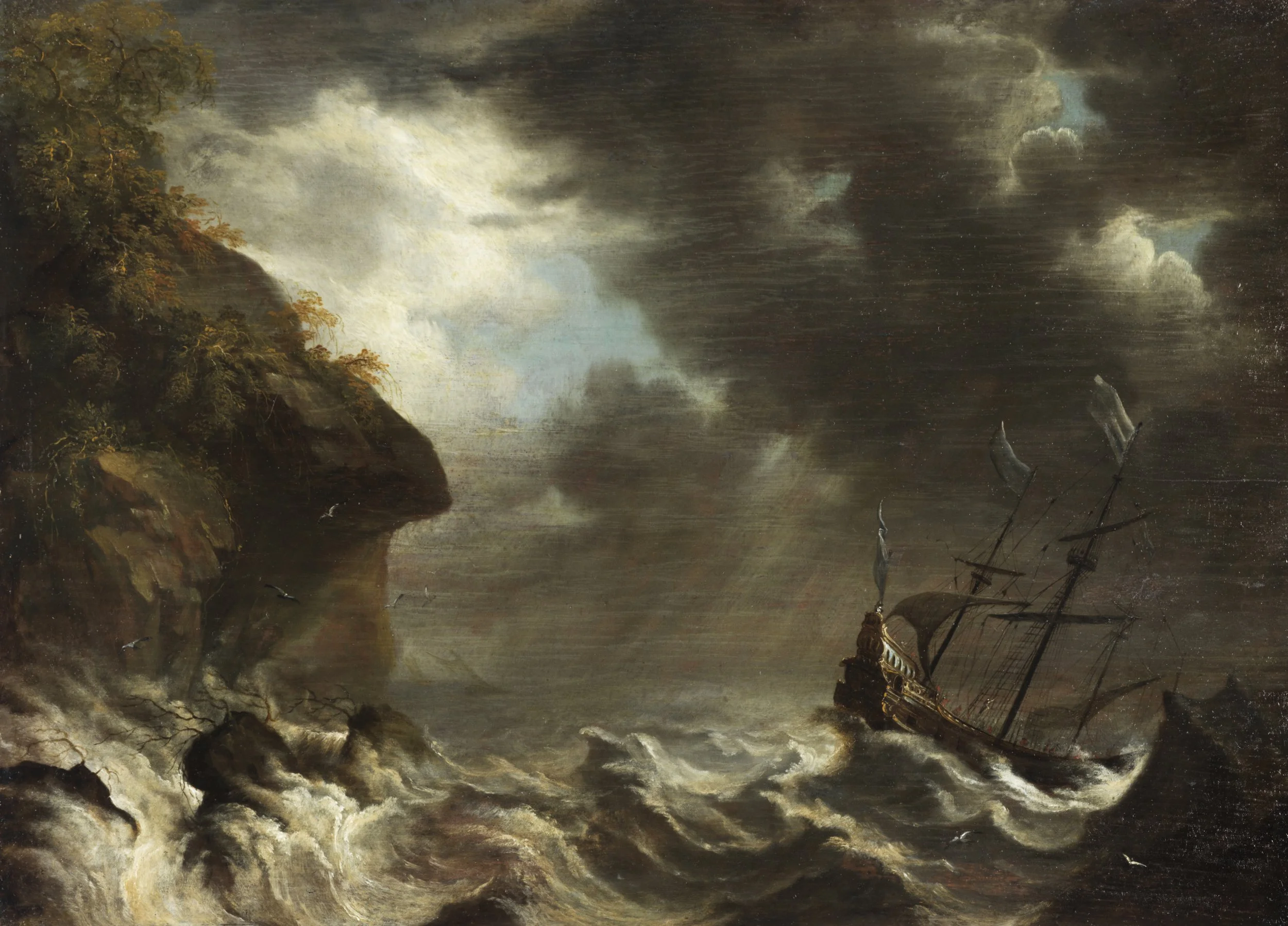 Beyond the rock formation on the left that frames the scene, two additional ships can be discerned on the distant horizon. Will they be spared? Beneath the spectacle of the tempest and its impending aftermath, the painting offers a deeper moral reflection, invoking the age-old metaphor of the ship as a symbol of political order or as an allegory of the human passage through life.