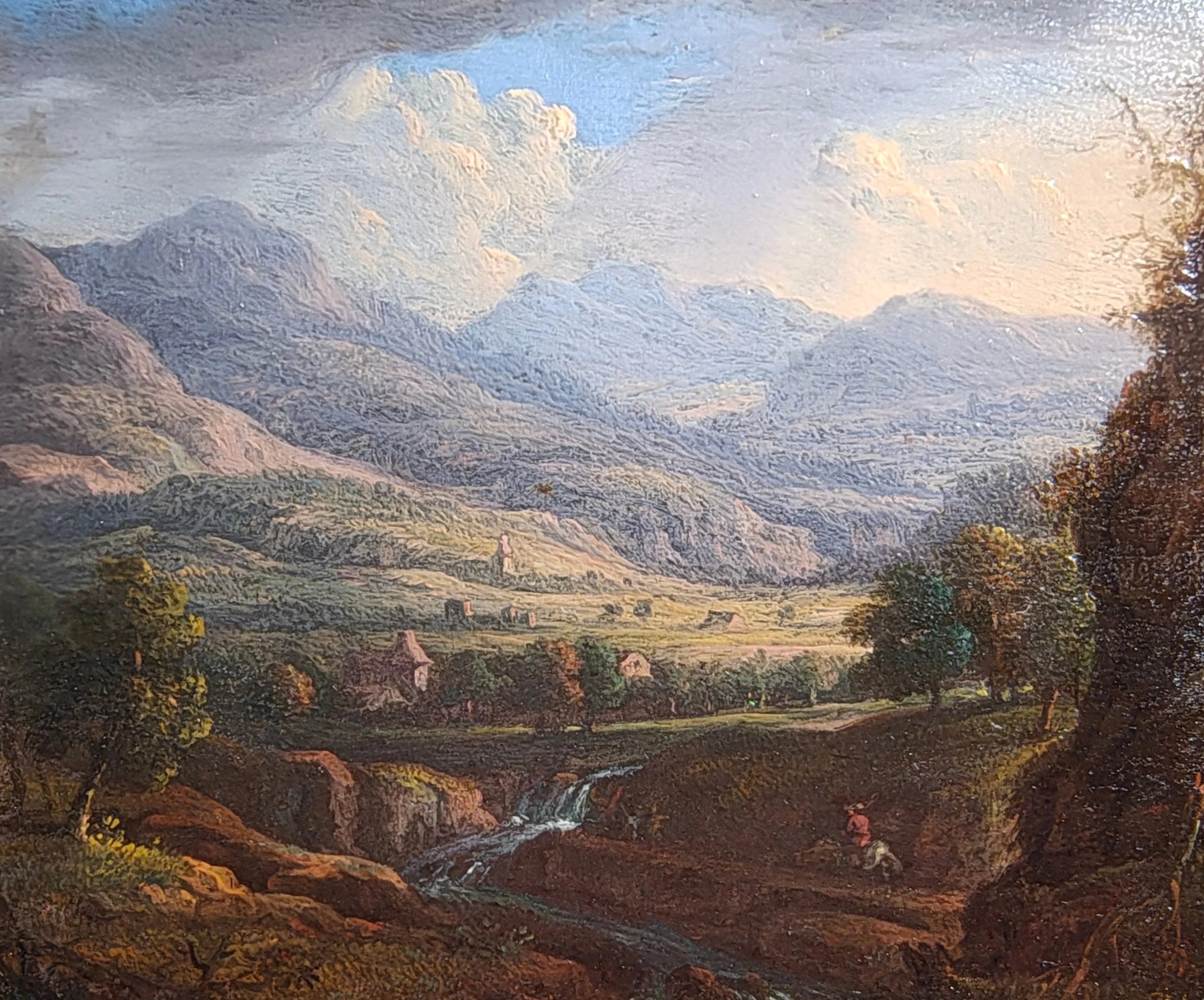 Der Mittelgrund öffnet sich zu einem kultivierten Tal, das sparsam mit flüchtig dargestellten Häusern zwischen belaubten Bäumen besiedelt ist. Im schattigen Vordergrund dient eine vorspringende Felsformation als repoussoir, verankert die Komposition und führt den Betrachter in die bildliche Tiefe. Sanft artikulierte Hügelketten lösen sich allmählich in der Ferne auf und weichen sonnenbeschienenen Hängen, die den Horizont rahmen. Ihre gedämpfte Beleuchtung kontrastiert mit dem schattigen Laub der verstreuten Gebäude im Dorf darunter. Von hier aus schlängelt sich ein lebhafter Bergbach nach vorne und lenkt den Blick des Betrachters zum Vordergrund.